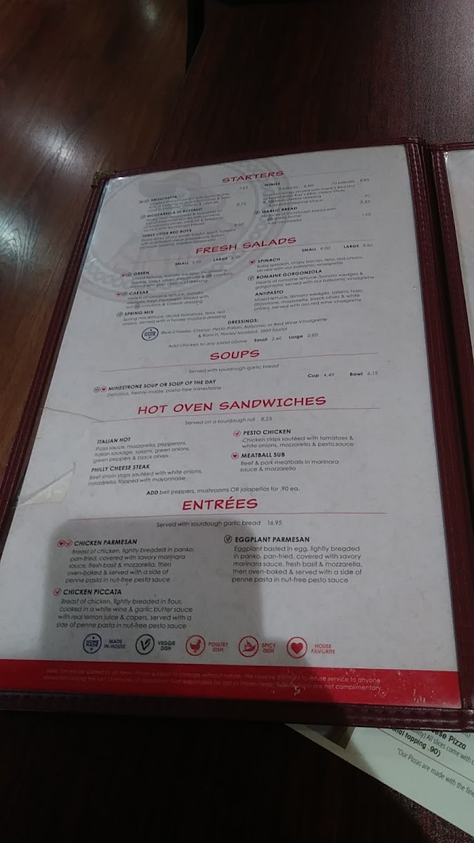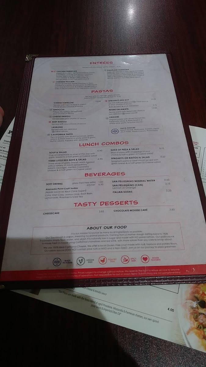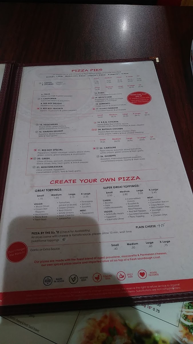 From a reviewer’s perspective, the menu at Red Boy Pizza on Redwood Road offers a well-rounded selection that goes beyond pizza, making it easy to find something for everyone. The pizza selection is a highlight, especially the Pizza Sorrento Small 10" (6 Pieces) - $15, BBQ Chicken Pizza Small 10" (6 Pieces) - $19, Devil's Dare (Medium 12") - $14, Garden Delight Small 10" (6 Pieces) - $16, and the large Pizza Italia Extra Large 16" (12 Pieces) - $6, offering a range of flavors from classic to bold. Pasta lovers can enjoy comforting options like Tortellini, Cheese Ravioli, Penne Kalamata Pasta, Beef Ravioli, and Fettuccine Alfredo, while the kids’ menu includes simple favorites such as 2 Meatballs, Kids Tube Pasta, Kids Spaghetti, Kids Beef Ravioli, and Kids Cheese Ravioli. There are also satisfying Hot Oven Sandwiches like Pesto Chicken, Philly Cheese Steak, Italian Hot, and Meatball Sub, along with fresh options like Green Salad (Large), Spring Mix Salad (Large), Spinach Salad (Large), Spinach Salad (Small), and Caesar Salad (Large). To start, appetizers such as Mozzarella Sticks, Mozzarella Di Buffalo, Garlic Bread, Red Hot Wings, and Garlic Cheese Bread pair nicely with beverages like San Pellegrino, Soft Drinks, and San Pellegrino Mineral Water, and the meal can be finished with desserts like Lava Cake, Chocolate Mouse Cake, or Cheesecake, making the menu varied, comforting, and family-friendly overall.
